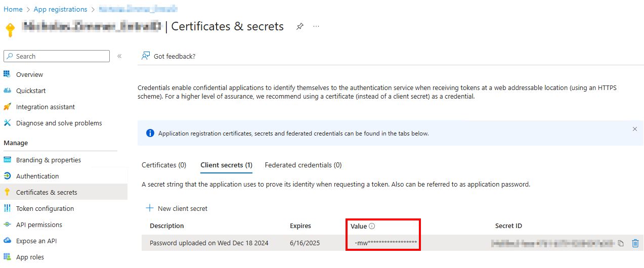 - Client Secret: This is the Secret Value copied earlier.