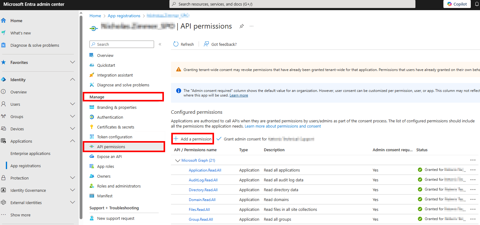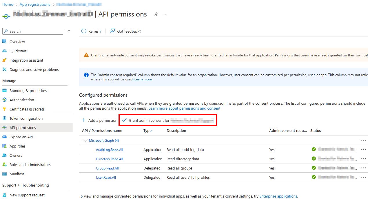 After adding the permissions, grant admin consent by selecting Grant admin consent for {TENANT NAME}.