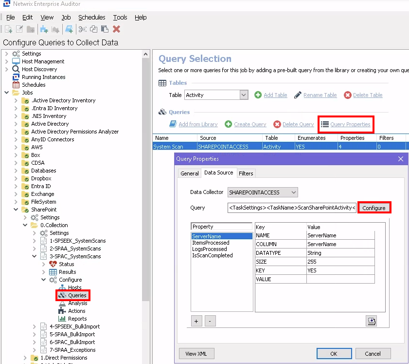 In Netwrix Access Analyzer, navigate to SharePoint > 0.Collection > 3-SPAC_SystemScans > Configure > Queries > Query Properties > Configure.