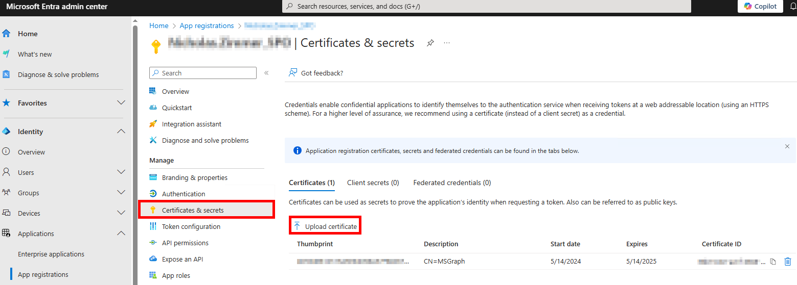 Navigate back to the SharePoint App registrations page, and on the Certificates & Secrets page, click ↑ Upload certificate to upload the
