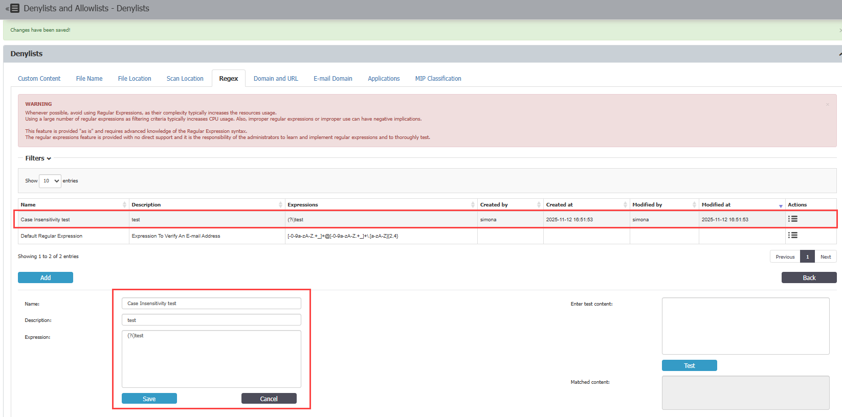 - The Regex pattern is defined, added to the dictionary, and saved. Ensure that it is also included in the CAP Policy for proper application.