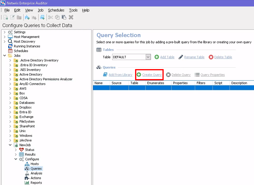 - Navigate to the Configure node of the NewJob and select the Queries node.