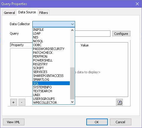 DropSQLHostData). - In the Data Source tab, select SQL from the Data Collector dropdown menu.